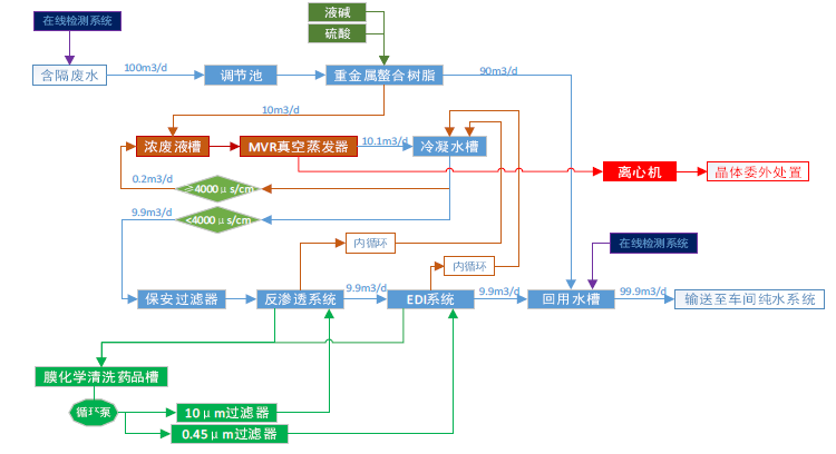 太陽能廢水處理按照產(chǎn)品不同可分為多晶硅廢水處理、單晶硅廢水處理、薄膜廢水處理。其中多晶硅廢水主要污染物為氫氟酸及少量有機物,單晶硅為氫氟酸和COD,薄膜電池板是重金屬、有機物等污染物。我公司根據(jù)不同的產(chǎn)品選擇不同的處理工藝。以下為一套典型的薄膜太陽能廢水處理工藝: